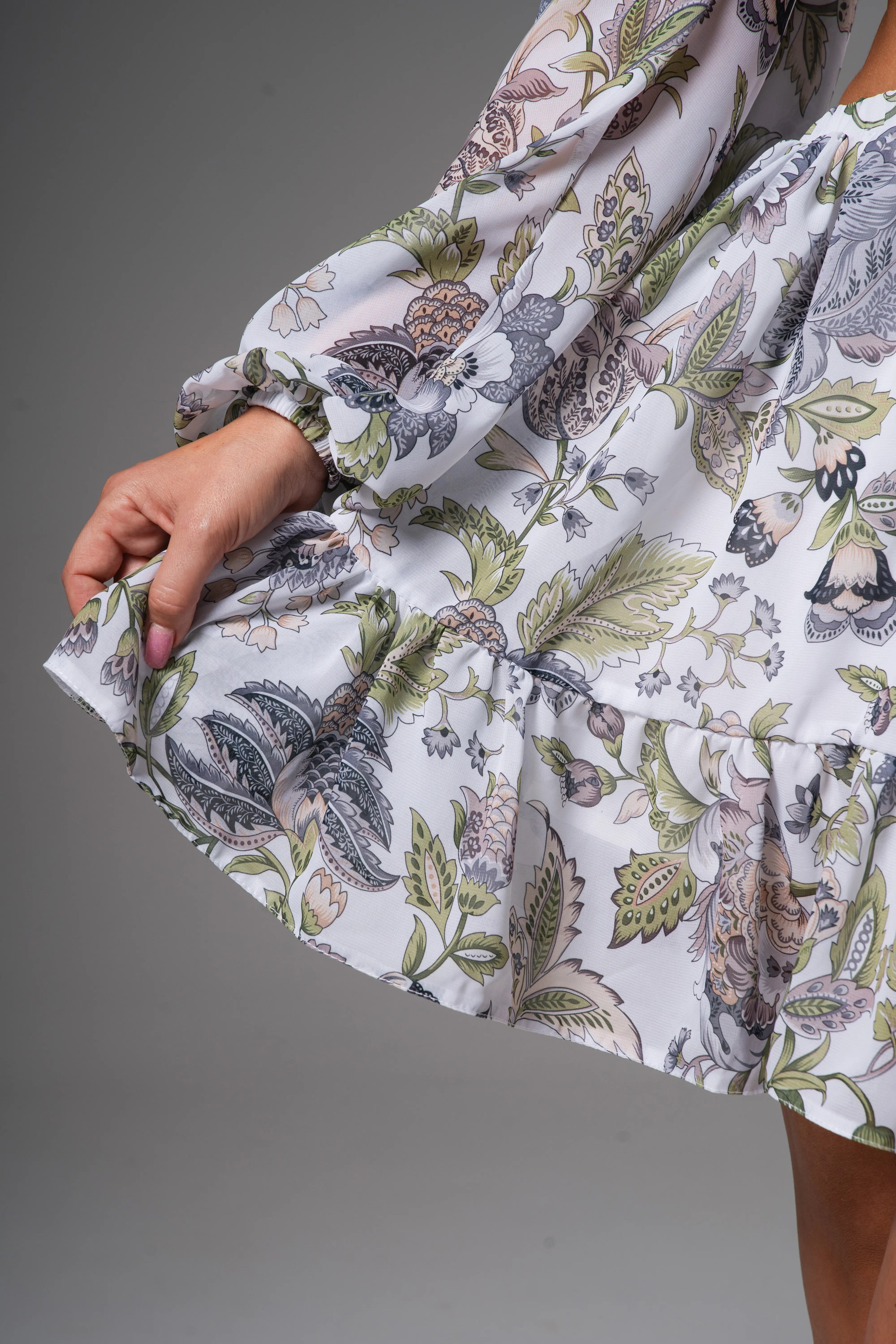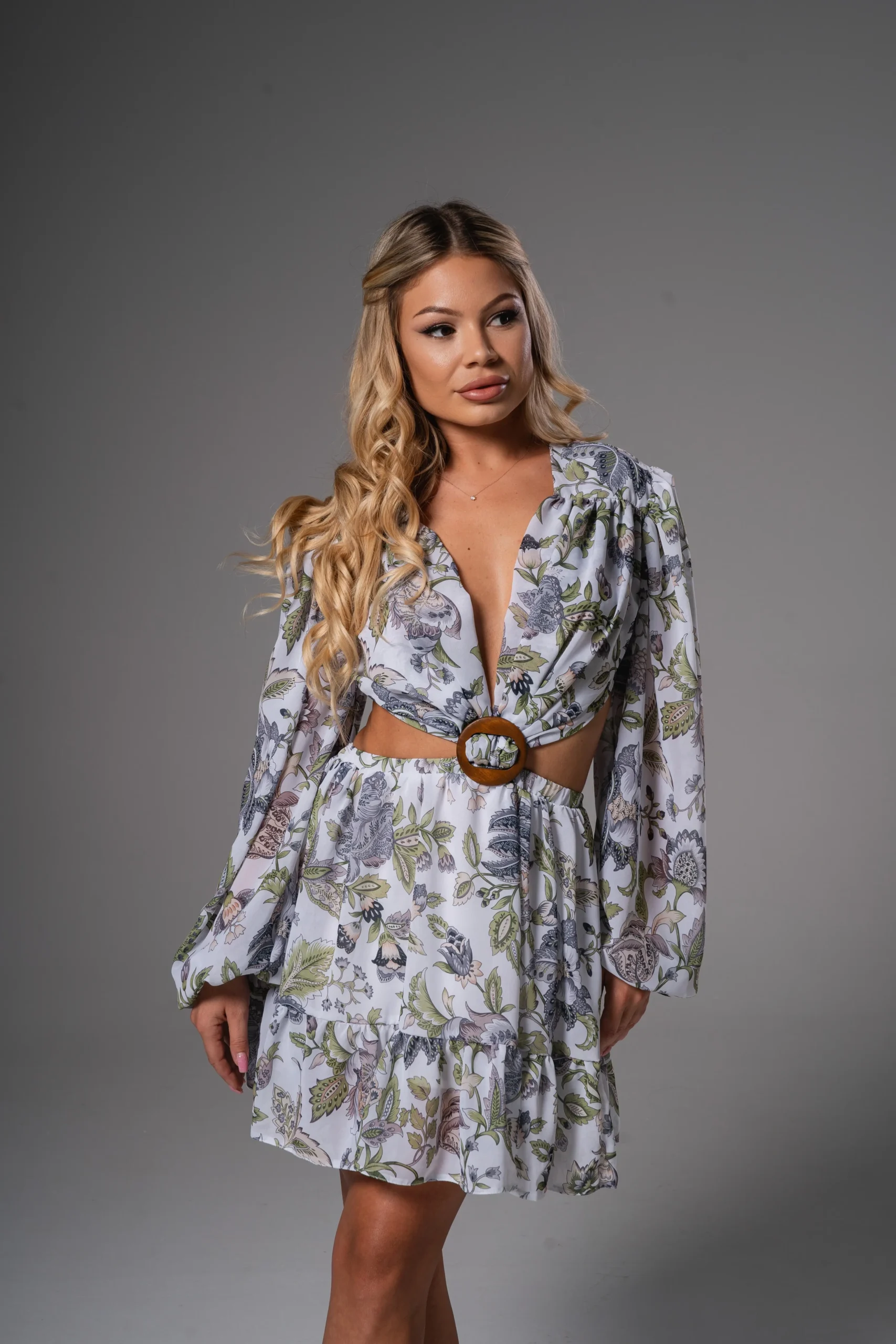 Елегантна рокля с флорални мотиви и изрязани детайли.Изработена от лека и приятна на допир материя тя съчетава комфорт и стил.Флоралният принт придава свежест, а дълбокото V-образно деколте и изрязаните детайли в талията добавят нотка на женственост и изтънченост.Декоративната кръгла тока, може да се регулира, подчертава талията и създава красива силуетна линия.Роклята е изработена със свободно падащи буфан ръкави.